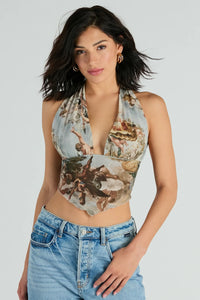Catch Your Eye Art Print Halter Crop Top Catch Your Eye Art Print Halter Crop TopCatch everyone's eye with your beauty in this detailed art print crop top! The stretchy mesh fabric is accented with a gorgeous renaissance art print that will be the statement of your look. The top is shaped with a sleeveless plunging V-neckline, halter straps with a tie-back design, a partially open back, and a cropped asymmetric hanky hem. Style this form-hugging top with jeans and sneakers for a casual-chic vibe. Fit & Features - Renaissance art print