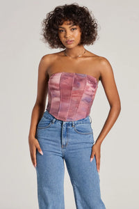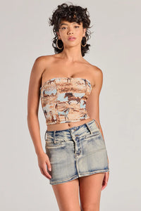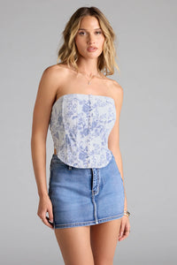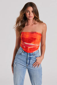 Keep It Alluring Abstract Mesh Strapless Bustier Top Keep It Alluring Abstract Mesh Strapless Bustier TopKeep it alluring in this abstract printed mesh bustier top featuring a strapless straight-across neckline, flexible boning to provide structure, and a mid-length angled hem for that snatched silhouette. Style with high-rise jeans and heels. Fit & Features - Abstract printed mesh fabric