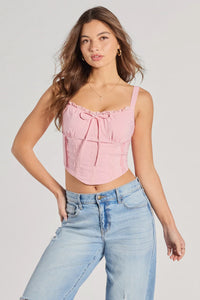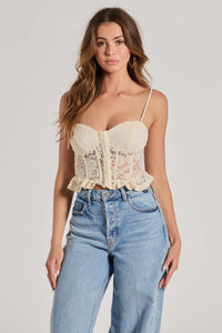 Delicately Femme Lace Trim Corset Top Delicately Femme Lace Trim Corset TopLevel up your look with this lace trim corset top. Featuring a lace scoop neckline, adjustable straps, and a smocked back, it's all about those dreamy details. Fit & Features - Smooth woven fabric, sewn-in knit lining, minimal stretch