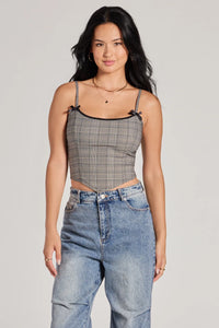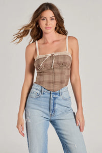 Preppy Vibe Lace-Up Plaid Corset Top Preppy Vibe Lace-Up Plaid Corset TopThis corset top features adorable bow trims along the scoop neckline and a trendy lace-up back. Perfect for styling with denim jeans. Fit & Features - Plaid print, woven fabric