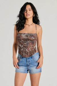 Sunset Dream Scroll Print Mesh Corset Top Sunset Dream Scroll Print Mesh Corset TopChase cocktails at sunset in this dreamy mesh corset top perfect for rooftop bars by the beach! Boasting a sultry cowl pleated neckline that flatters your bust and spaghetti straps that cross along the back for head-turning detail, this corset is a must-have. The flexible boning inserts and cropped hem provide a snatched look. Complete the look in a midi skirt and clear mules for a seamless style! Fit & Features - Scroll print, stretchy mesh fabric lined with knit