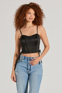 Love It Lace-Up Satin Cropped Corset Top Love It Lace-Up Satin Cropped Corset TopYou'll love the iconic look of this silky satin cropped corset top! Designed with a sleek satin woven fabric, this top features a sleeveless sweetheart neckline for a feminine vibe, adjustable spaghetti straps offering a customized fit, secure hook and eye closures at the front, and flexible boning inserts. The cutout lace-up sides add a sultry touch, while the fitted cropped hem will create a snatched silhouette. Pair with high-rise jeans and sneakers for a casual-chic style. Fit & Features - Satin woven fabric with minimal stretch