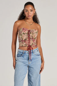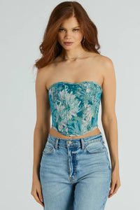 Blooming Beauty Tapestry Lace-Up Cropped Corset Top Blooming Beauty Tapestry Lace-Up Cropped Corset TopLet your style bloom in this cropped corset that features a strapless sweetheart neckline with a velvet lace-up front for a secure fit, a floral tapestry jacquard woven fabric, and hook-eye back closures. Complete the outfit with jeans. Fit & Features - Floral jacquard tapestry woven fabric, no stretch