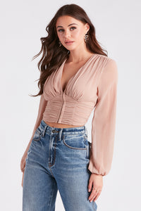 Casual And Chic Allure Cropped Blouse Casual And Chic Allure Cropped BlouseBring the casual and chic allure to your look with this lightweight chiffon blouse! It features a V-neckline, a flattering underbust seam, long bishop sleeves, a front ruched design at the waist with hook and eye closures, a smocked back panel, and a fitted cropped hem. Style with high-rise jeans and strappy mules for a date night. Fit & Features - V-neckline, underbust seam