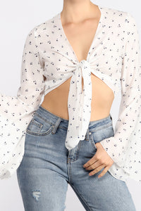 Look just as sweet as can be in this adorable floral bell sleeve top! Pair with some high rise white denim cut off shorts or jeans and strappy heels for the perf fresh spring time vibe.