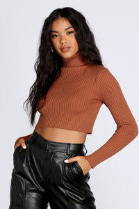 Get that trendy chic vibe with this of the moment turtleneck sweater. It features long fitted sleeves paired with a cropped, form hugging fit. The sweater is composed of a ribbed knit fabric with plenty of stretch.