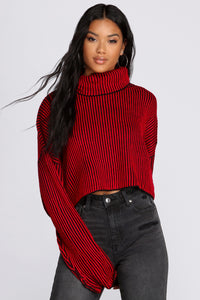 Throw it back and get a trendy vibe with this ribbed knit sweater! It features a turtleneck, long dolman style sleeves, and a cropped hem with a relaxed and comfortable fit. The ribbed knit fabric features contrasting hues and offers moderate stretch.Style Number/Barcode: 06005-0258