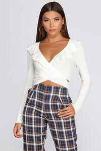 This ruffle wrap front crop top will give you an effortless casual chic vibe! It features long fitted sleeves, a plunging wrap front V neckline with an adorable ruffle trim, and a cropped hem with a tie back closure. The ribbed knit fabric offers plenty of stretch and a form-fitting style.Style Number/Barcode: 06001-1639