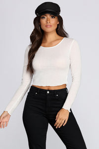 This adorable basic sheer crop is for sure a stylish choice. The top features a crew neckline, long fitted sleeves, a cropped hem, and a merrow edge trim. The ribbed knit top has a lightweight feel and offers plenty of stretch.Style Number/Barcode: 06001-1815