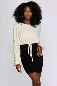 Cut for a relaxed fit, this cozy crop will become your new casual-chic go-to. Top features all-over vertical ribbing, a round neckline, long, balloon-style sleeves with gathered cuffs, and a drawstring tie cropped hem. Top is made from a super-soft woven rayon blend with a touch of stretch.