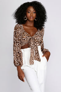 Define your look as fierce and fashionable with this trendy printed crop top perfect for transtioning to fall! It features long balloon sleeves with elastic cuffed hems, a V neckline created by a tie front detail, and a cropped hem. The top is composed of a lightweight, airy woven fabric with no stretch.Style Number/Barcode: 06003-0326