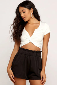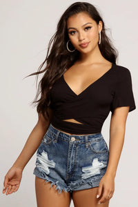 This twisted front crop top is anything but basic! It features short sleeves, a notched detail V neckline, a trendy twist front, and a cropped hem. The top is composed of stretchy knit fabric that offers a form hugging fit.Style Number/Barcode: 06001-1484