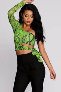 Deadly never looked so sexy. This crop has a round neckline, spaghetti straps, a knot detail at the center, and a cropped hem that meets at the rib area. The crop is composed of a soft knit material that offers moderate stretch, and show cases a brushed print that will have them lookin out for danger. Don't forget the matching midi skirt!