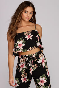 Feel the island vibes in bold, after-dark florals! This elegant crop top features adjustable spaghetti straps, a pink and black ruffle overlay, and a solid, tube-style black underlay with back zip. Top is made from a lightweight, lightly textured woven material with a touch of stretch. Don't forget to pair it with the matching tie-waist pants!Style Number/Barcode: 06003-0242