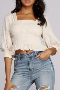 Sweet and smocked, this cropped top is perf for a nice day outing. It features a square neckline, three quarter length puff sleeves with smocked cuffs and eyelet detailing along the shoulders, a stretchy smocked bodice, and a ruffled cropped hem. The top is composed of a lightweight woven fabric.