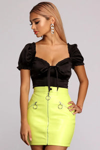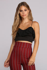 Hey there sweet thing! Are you loving ruffles as much as we are? This crop top has a sweetheart neckline with a ruffle detailing, spaghetti straps, and a fitted bodice! It is composed of a crepe material that offers a moderate stretch.