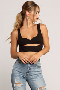 Not only do we love a sexy crop top, but we love a little comfort too. We are a sucker for a soft top. This top has a round neckline with a v cut out at the center, it is sleeveless, and cropped to hit at your rib area. The top has a horizontal cut out above the hem, and is composed of a soft crepe material that is form fitting yet offers moderate stretch.Style Number/Barcode: 06001-1540
