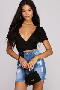 You already look good—now guarantee you stay fly in this crop! Layer over tanks or bodysuits and team with denim for effortless casual chic. Top features flutter sleeves and a wrap bodice with two long ties meant to wrap around the waist. Top is made from an ultra-soft knit material with moderate stretch.