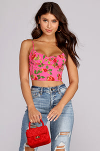 Bright and beautiful, this blossom-adorned bustier crop will let you shine. Top features an all-over rose print, adjustable spaghetti straps, gather-detailed underwire cups, and a lace-up tie back. Crop is made from a soft woven material with a touch of stretch.Model is 5'9" with a 32" bust, 24" waist and 34.5" hips. She is wearing a size small.