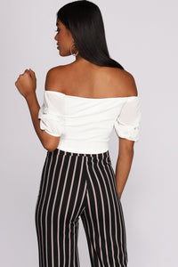 Get those major stripe vibes with this adorable twist front crop top! It features long sleeves with elastic cuffs, a deep V neckline with a twist front detail, and a cropped hem with an elastic banded back. The top is composed of a lightweight, airy woven fabric with no stretch.Model is 5'9" with a 32" bust, 24.5" waist and 35" hips. She is wearing a size small.