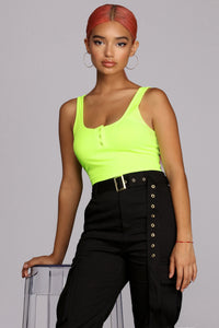 Have a moment in this fun and trendy crop top! It features a sleeveless bodice, tank-like shoulder straps, a scoop neckline, a partial snap button front, and a cropped hem. The henley top is composed of a ribbed knit fabric that offers plenty of stretch.