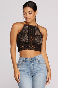 Yes queen! Style this crochet crop top for a fun night out with the girls! It features a sleeveless bodice, bungee straps with a halter neckline, a sheer front inset, an exposed back zipper closure, and a cropped hem. The top is composed of a sheer crochet fabric with a partial front lining.