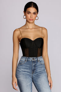 Whether you're showing off just a little...or a little more, this mesh crop bustier will draw all eyes. Bustier features adjustable spaghetti straps with chain links, lightly padded molded cups, a contrast satin panel at front, and hook-and-eye closure at back. Bustier is made from a mesh-blend fabric and offers moderate stretch.Model is 5'7" with a 34" bust, 24" waist and 36" hips. She is wearing a size small.