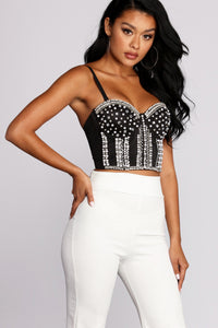 You'll be ready to party in this oh so glam embellished by hand bustier! The top features a sleeveless bodice, adjustable spaghetti straps, a bustier style neckline with structured and padded cups, a low back with multiple hook and eye closures, and a cropped hem. The top is composed of a knit fabric and is hand embroidered with an intricate design of rhinestones and pearls that will dazzle under the lights!Model is 5'7" with a 34" bust, 24" waist and 36" hips. She is wearing a size small.