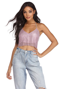 Complement your beauty with these sparkling gems! This sparkling, crop top has a halter neck that closes with a lobster clasp and is adorned with dazzling rhinestones set in a leopard pattern. The garment is composed of a chain main metal that includes a smooth, satin lining paired with a lace up back.