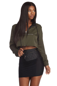 You're to cool to zip with! This burgundy, long sleeve windbreaker includes a drawstring hood paired with a partial zipper front, a faux zip pocket, and a cropped drawstring hem.