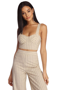 Lose your ish over how cute this crop top is! The bustier top has a lightly padded bust with built in cups and wide shoulder straps. The cropped top is composed of a lined, woven fabric with a smocked back for a fitted appearance and features a pinstripe pattern throughout. Don't forget to purchase the matching pants!
