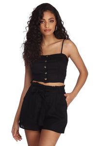 You'll look oh so lovely in linen in this pretty crop top! It features a sleeveless bodice, adjustable spaghetti straps, a square neckline, a partially smocked back, a button down front, and a cropped hem. The black top is composed of a lightweight, semi-sheer linen fabric with no stretch. Complete your look with the matching paperbag shorts!