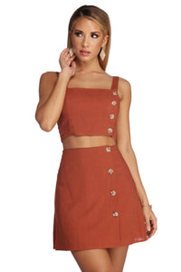 Because you're unforgettable wherever you go. This rust linen crop top features a square neckline, shoulder straps, decorative front buttons, and a smocked back. Don't forget the matching skirt to complete your memorable look!