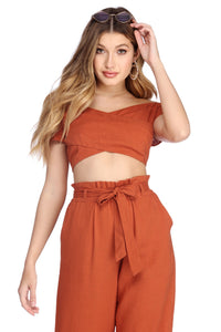 You'll be ready to take on your day in this too cute crop top! It features an off the shoulder neckline with short sleeves, a crossover front, a stretchy smocked back, and a cropped hem. The rust top is composed of a linen fabric with a form-fitting style. Complete your look with the matching paper bag pants!Model is 5'9" with a 32" bust, 24" waist and 35" hips. She is wearing a size small.