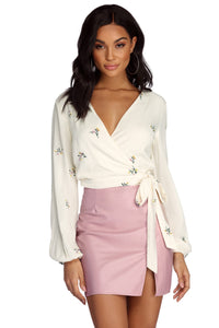 Spring into action with this classy floral top! It has a flattering wrap front with a side tie closure and long sleeves featuring cinched cuffs. The wrap blouse is composed of a light, woven fabric and features a ditsy, floral embroidery.