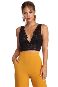 All you need is crochet to elevate your look! This black crop top features a sleeveless bodice, a plunging V neckline with a scalloped lace trim, a back zipper and hook and eye closure, and a cropped hem. Top is sheer and lined only at the bodice.Model is 5'9" with a 32" bust, 24" waist and 34" hips. She is wearing a size small.