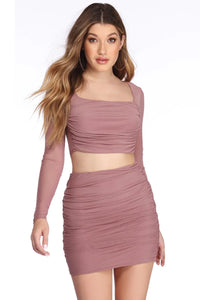 There's more to love with this adorable mesh crop top! It features a square neckline, long fitted sheer sleeves, a sheer back, a front lining and ruching, and a cropped hem. The mauve top is composed of a mesh fabric that offers a form hugging fit and plenty of stretch. Complete your look with the matching mini skirt!Model is 5'9 with a 32" bust, 24" waist and 35" hips. She is wearing a size small.