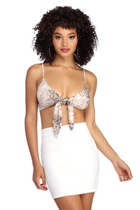 Slay in trendy snake print in this cute crop! It features a plunging V neckline with a tie knot bodice and adjustable straps. The all over snake print features taupe and white hues. Top is composed of a soft knit fabric with plenty of stretch.Model is 5'9" with a 34" bust, 24" waist and 34.5" hips. She is wearing a size small.