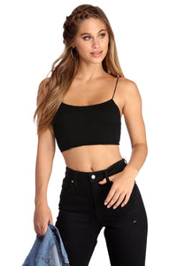 You'll look like a total rock star in this smocked crop top! It features a sleeveless bodice, shoulder straps, a scoop neckline, and a cropped hem. The black top is composed of a smocked knit fabric with plenty of stretch.Model is 5'6.5" with a 32" bust, 23.5" waist and 35" hips. She is wearing a size small.