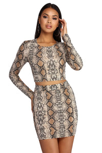 Slither in style with this must have crop top! It features a rounded neckline, long fitted sleeves, and a cropped hem. The top is composed of a snake printed knit fabric that offers plenty of stretch and is form-fitting. Don't forget to purchase the matching mini skirt!