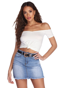 Let them know it's not over yet! This cute basic top features an off the shoulder neckline, with a slight sweetheart bust and a knotted bodice accent. Top is composed of a smooth knit fabric that offers a relaxed fit with a moderate stretch.Model is 5'9 with a 33" bust, a 24" waist, and 35.5" hips. She is wearing a size small.
