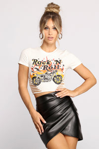 Bring the edge in this slashed tee! The tee features a crew neckline, short sleeves, and a graphic that reads: "Rock N' Roll" with a motorcycle graphic. Complete your look with a high waist skirt.