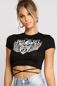 Hit the road in this graphic crop top! The top features a crew neckline, short sleeves, and a graphic that reads: "Road Race" complemented with angel wings. Complete your look with high waist jeans and combat boots.