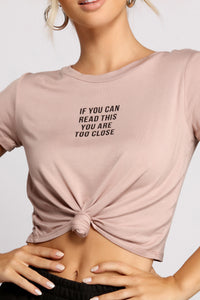 You need space, girl! Let this tee do the speaking for you. The tee features a crew neckline, short sleeves, and a graphic that reads: " If You Can Read This You Are Too Close". The sassy knot hem styles well with high rise biker shorts!