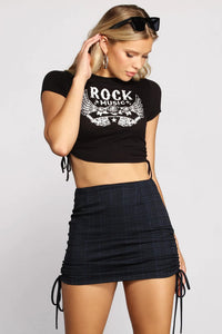 Bring the good vibes in this crop that will have you rocking your outfit! The crop top features a graphic that reads: "Rock Music" that is accented with angels wings and sweet roses. The crop features drawstrings at the sides to adjust as needed. Complete outfit with a plaid skirt and boots.