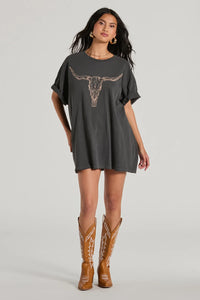 Unleash your inner cowgirl cutie in this oversized graphic tee perfect for country babes! The tee features a crew neckline, oversized short sleeves, and a silhouette with a trendy longhorn bull graphic on a vintage-inspired mineral wash knit fabric. Complete the look in denim shorts or style it as a cute dress with cowboy boots for a festival, concert, or fair!