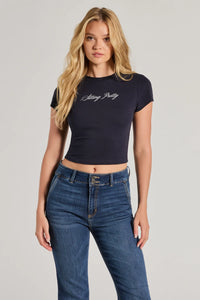 Style up this adorable graphic tee featuring a crew neckline, short sleeves, a front cursive script reading, "Sitting Pretty," and a fitted mid-length hem. Pair with high-rise jeans and sneakers!