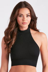 This everyday basic seamless ribbed knit crop top needs to be in your lineup! It features a sleeveless mock neckline with a halter design, a partially open back, and a fitted, banded, cropped hem. The lightweight knit fabric offers plenty of stretch for comfortable wear. Style with sculpting biker shorts.