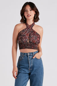Show your sultry side in this boho print crop top perfect for festival babes! It features a sleeveless plunge halter neckline, tie-neck closure, open-back, and a smocked hem on non-stretch woven fabric. Complete the look in high-rise denim shorts.