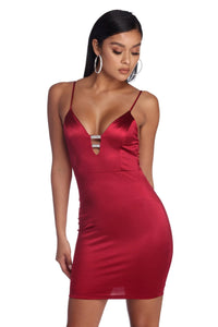 You'll be lookin' like a glam doll in this red satin mini dress! It features a deep V neckline, spaghetti straps, a V front with rhinestone bar details, a high waist seam, and a slim fit. Dress is composed of an unlined, satin knit fabric with a moderate stretch.
